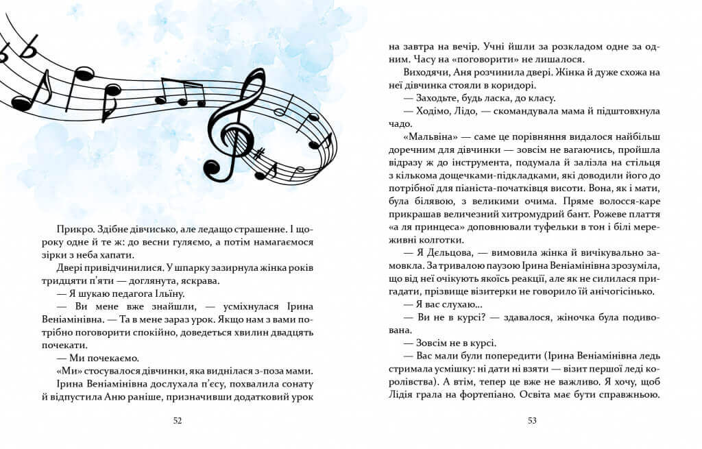 Окреме задоволення ви отримаєте від оформлення видання та ілюстрацій, що виконані у сіро-блакитних тонах. Дякуємо за те художницям Олені Кириченко та Ользі Кузнєцовій. М’які блакитні акварельні плямки на текстових сторінках та розсип ноток між розділами дуже доречно і гармонійно вписуються в атмосферу твору.