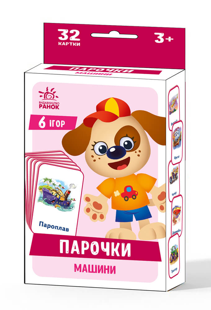 Ігри «Машини» з серії «Парочки» призначені для дітей дошкільного й молодшого шкільного віку. У наборі ви знайдете 6 захопливих ігор, які допоможуть розвинути логічне мислення, мовлення, пам’ять і увагу. Грати можна як з однією дитиною, так і з групою дітей.
