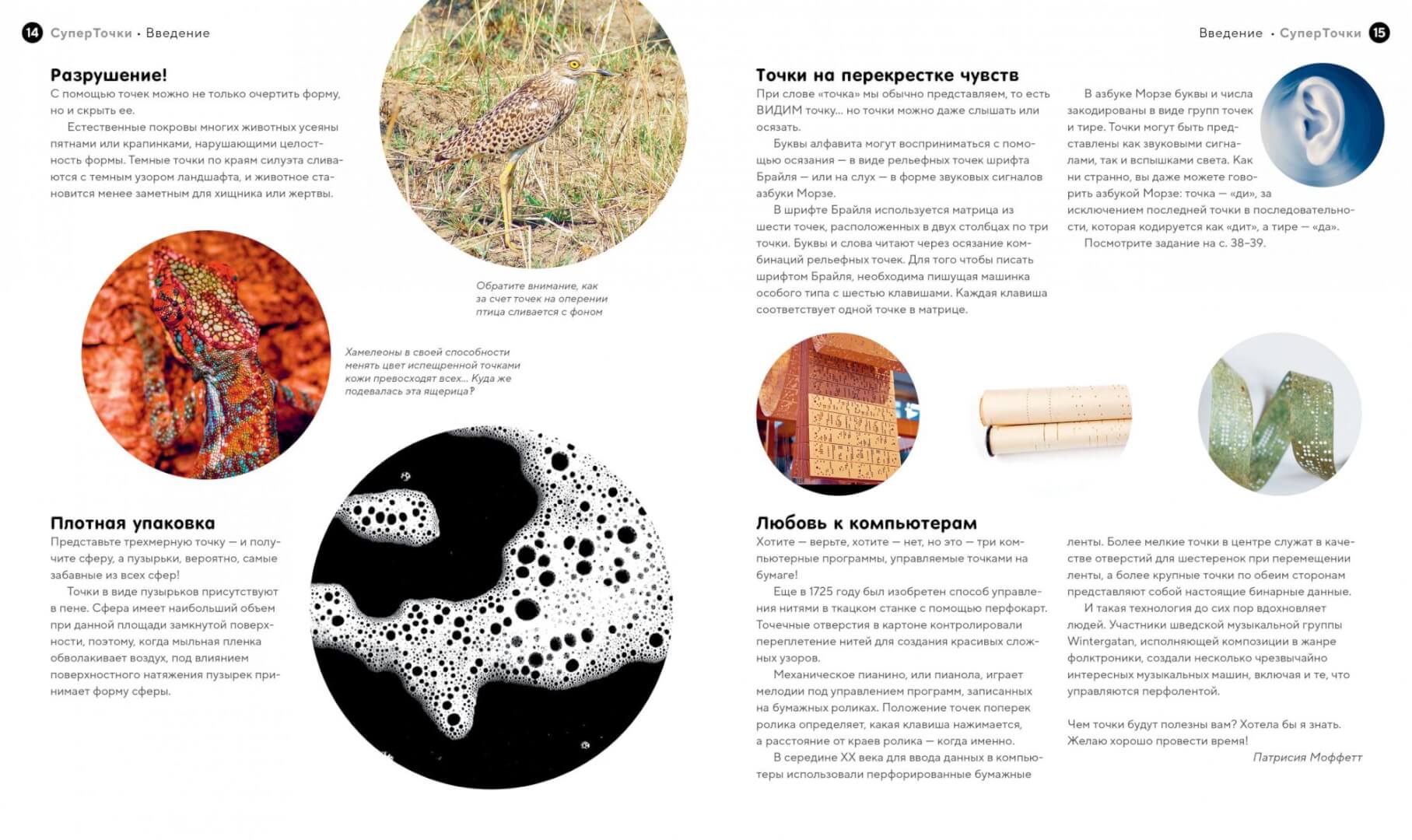 «Вы будете удивлены, как с помощью головоломок, игр и творческих заданий “мастерская точек” помогает постичь видимую и концептуальную красоту науки и природы. Автор этой книги, Патрисия Моффетт, известна своими книгами-раскрасками и прекрасно иллюстрированными книгами для досуга, детально изображающими сказочных персонажей в сказочных мирах. Не теряйте времени, погрузитесь в этот захватывающий мир точек», — Джанни Сарконе, художник, исследователь визуальности