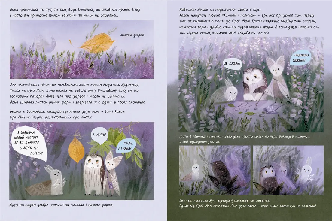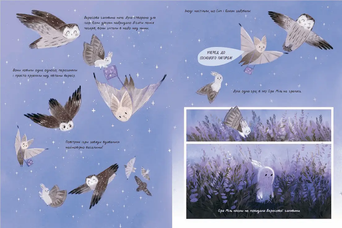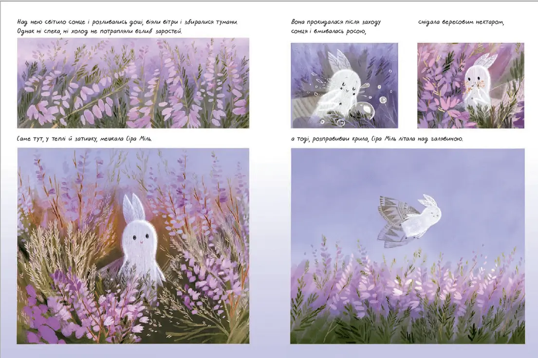 Звідки беруться кольори вдень і куди вони зникають вночі? Про це знає Сіра Міль. Вона живе на Вересовій галявині і понад усе боїться денного світла. Сіра Міль звикла ховатися у заростях вересу і показуватися зі сховку лише з настанням темряви. Вона мріє побачити дерева, але ніколи не покидає свою галявину. Сіра Міль впевнена у тому, що вона — єдина міль на світі.